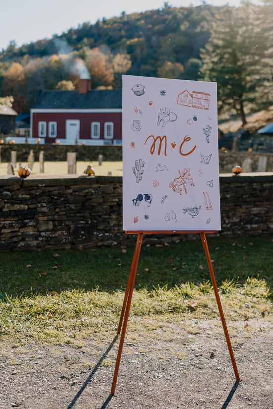 Personalized illustrations for a joyful Upstate NY wedding, capturing the couple's story through banners, menus, programs, seating charts, table numbers, and name cards—each piece adding a unique touch to their celebrations.