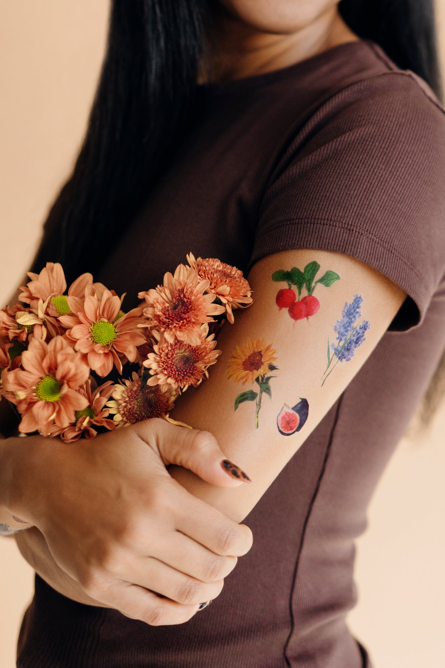 this collection of temporary tattoos of fresh fruits, veggies, and flowers will make you look radish-ing! Orange you glad these tattoos will last 2-4 days on your skin? -