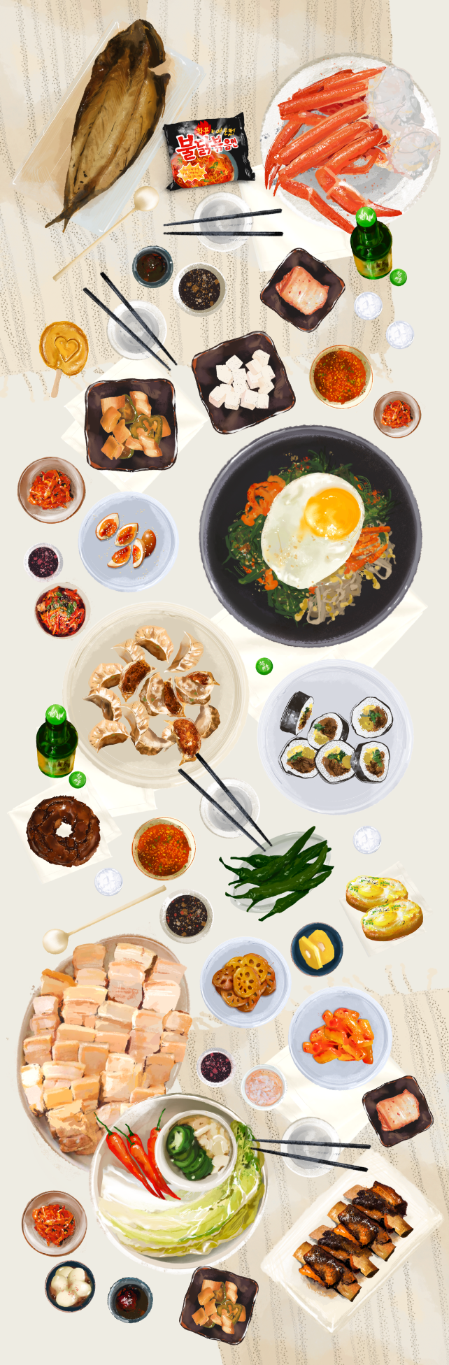 Other pieces include visual narrations of her time in South Korea reuniting with her birth family and later, living in Korea, connecting with other South Korean adoptees and her motherland culture. Food is deeply connected to one’s identity, culture, and memories. Through the flavors of one’s homeland cuisine, people can discover their roots and understand their identities. For adoptee artists and chefs, Korean food serves as a precious medium to uncover their identities and comprehend their cultural roots.