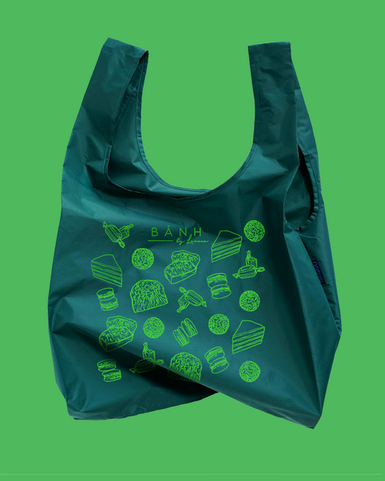 Illustrated Bánh by Lauren treats—Bánh Bò Nướng, Bánh Cam, chiffon cakes, and macarons—for their Baggu tote. Available at 42 Market St, Chinatown NYC.